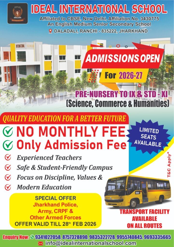 Ranchi, January 8, 2026:The vibrant team of Ideal International School enjoyed a joyful and refreshing picnic at the scenic Jonah Falls on Thursday. The outing turned into a memorable experience filled with enthusiasm, bonding, and natural beauty. The day was graced by the presence of the school’s inspiring Director, Dr. Sumbul Alam, and the dynamic […]